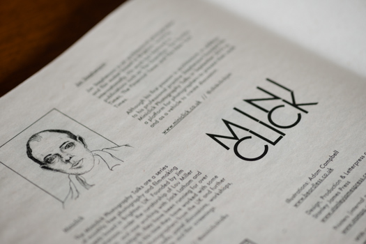 Writer and educator, Miranda Gavin is our editor, with Miniclick co-curator Lou Miller as sub editor and Miniclick founder Jim Stephenson as commissioning editor. The publication was designed by Stanley James Press and printed by Stampa.